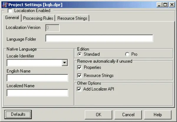 This dialog allows you to configure essential project localization parameters. The "Localization enable" checkbox, available when the project is not localized, initiates a wizard that scans your project and creates a native language file containing all project resources in the original programming language.
